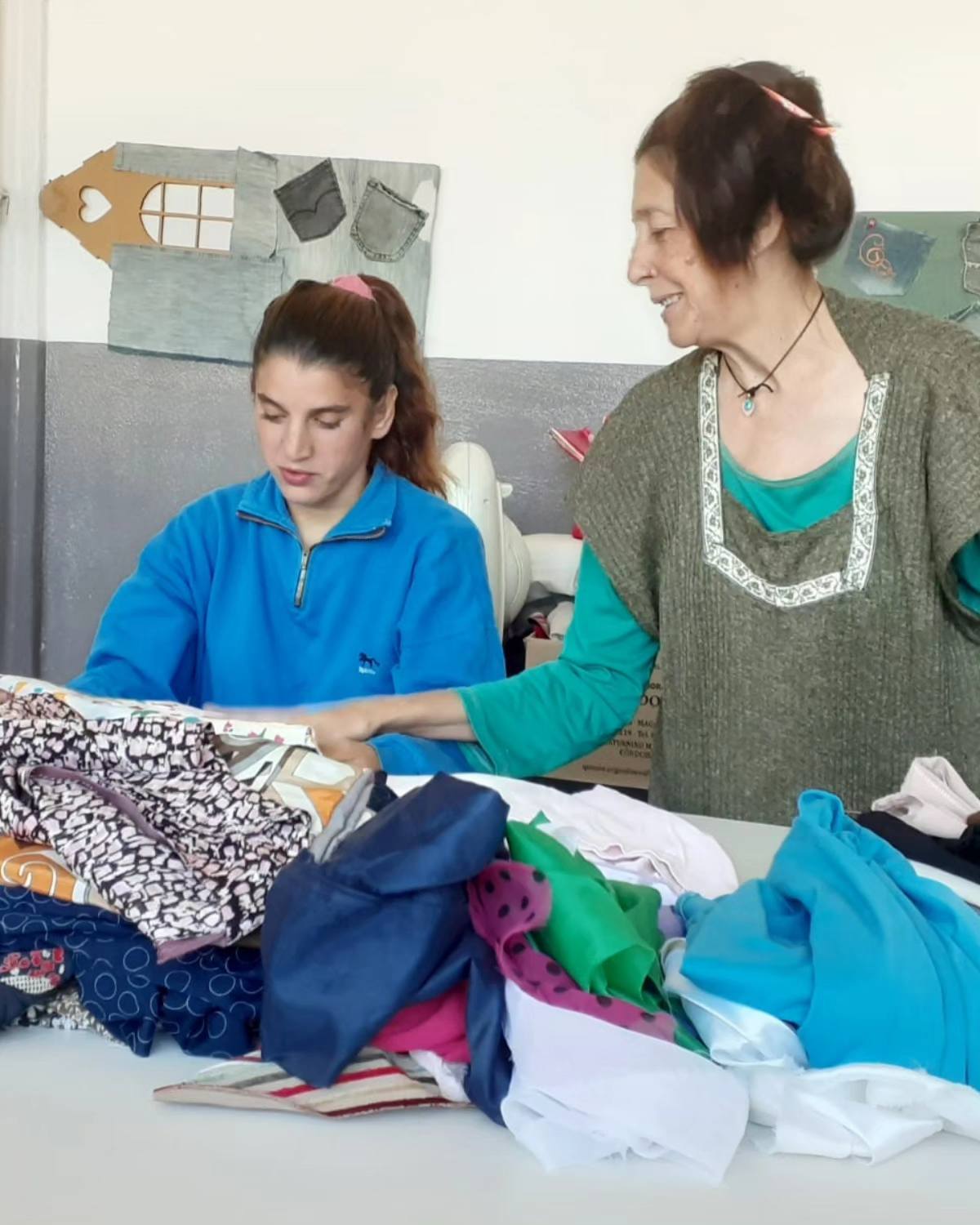 Todos los jueves, Laura se encarga de enseñar técnica y herramientas para las mamás de los y las peques en el taller de Reciclado Textil. Desde Nutrir La Esperanza alentamos y ayudamos a las madres con diferentes talleres para que puedan emprender e insertarse en el mercado laboral, además de crear cosas muy bellas.